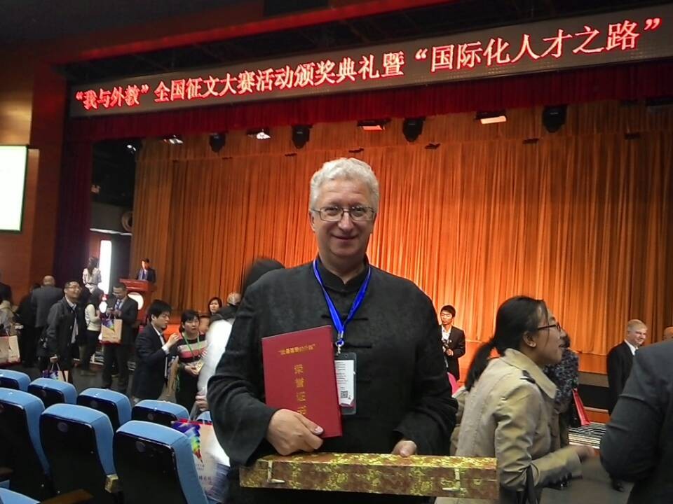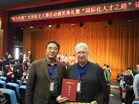 一分耕耘,一分收获。他对工作的付出和对生活的热爱也得到了回报:2012年荣获山 东 省 外 国 文 教 专 家 “教 学 奖”,2013年又荣获全国五十名“我最喜爱的外教”,并于2014年4月27日和我校外国语学院任东升教授一起应邀参加在北京师范大学举行的 “我最喜爱的外教”颁奖典礼。