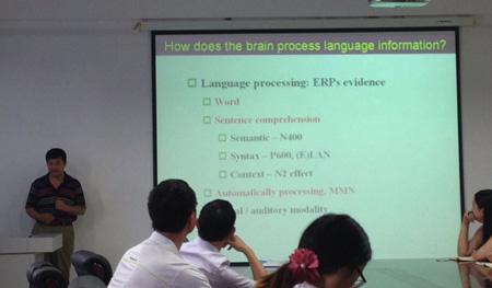赵仑博士的讲座包括三个部分:ERPs(事件相关电位)在语言学中的应用、EEG(脑电图)振荡在语言学中的应用和认知神经语言学的未来 。从ERP的基本原理出发,赵仑博士分析了语音、词汇、句法、语义等语言的不同层面在ERP成份中的表现,又结合EEG的不同频率,讨论了语言加工过程中 的频域特征,最后对比分析了认知语言学和神经语言学的差异以及结合产生的交叉学科——认知神经语言学,认为认知神经语言学以认知神经科学研究技术为主要手 段,包括多种实验技术,如行为、眼动、脑成像技术(EEG/ERPs, MEG, fMRI)等,通过分析语言现象来构建理论模式,表述和解释人类的语言系统。