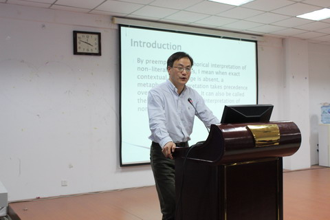 聘任仪式结束后,束定芳教授以“非字面表达的优先性隐喻解释(Preemptive metaphorical interpretation of non-literal expressions)”为题为外国语学院的青年教师和研究生举办了一场学术前沿讲座。束定芳教授首先对非字面表达的优先性隐喻解释的定义进行了解释:当特定的情景知识确实时,隐喻解释会优先于借喻解释。随后,束定芳教授用生动的例子进行了解释,并向我们分享了对此理论进行的一系列实证研究,指出了隐喻和借喻解释的现存理论流派以及这些流派存在的问题,最后提出了自己的解释和结论。在提问环节,束定芳教授详细地回答了师生们提出的问题。束定芳教授的讲解深入浅出,旁征博引,借助丰富多变的例句生动地阐述自己的理论观点,以有力的实证研究数据佐证了自己的分析及结论。讲座在热烈的掌声中结束。
