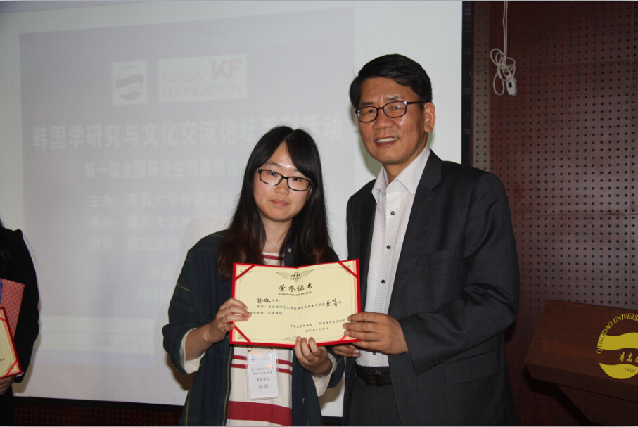 此次比赛由韩国国际交流财团赞助、青岛大学主办,参赛选手来自北京大学、南京大学、对外经济贸易大学等国内知名高校,评委由韩国国语文学学会会长、韩国梨花女子大学多文化研究所所长以及国内韩国语学术界知名学者组成。在评选中孙晓同学的“韩国语请求言语行为的敬语法研究”一文在选题、逻辑、写作等各方面得到评委们的认可,以最高分荣获一等奖。 (通讯员:柳新生)