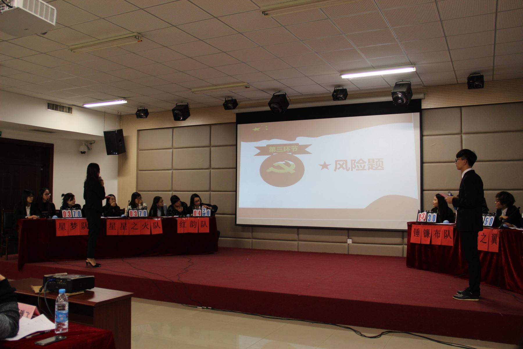 根据前期自愿报名及线上答题环节,共有六支代表队的十八名党员进入决赛。此次比赛由必答题,抢答题,风险题、观众互动及微党课五部分构成。整场比赛秩序井然,精彩纷呈。必答题环节中,各代表队你追我赶,比分不分上下,表现出扎实的知识积累;抢答题环节激动人心,场上竞争激烈,比分逐渐拉开距离;而到了风险题环节,选手们有的为规避风险放弃后面的难题,也有的铤而走险勇于尝试;观众互动环节更是将整场比赛的气氛推向了高潮;最后,各队派出的代表以微党课的形式为大家上了一堂堂或激情澎湃或情感深重的党课,“从严治党”、“两学一做”、“长征精神”等主题的阐释给老师和同学们留下了深刻的印象。