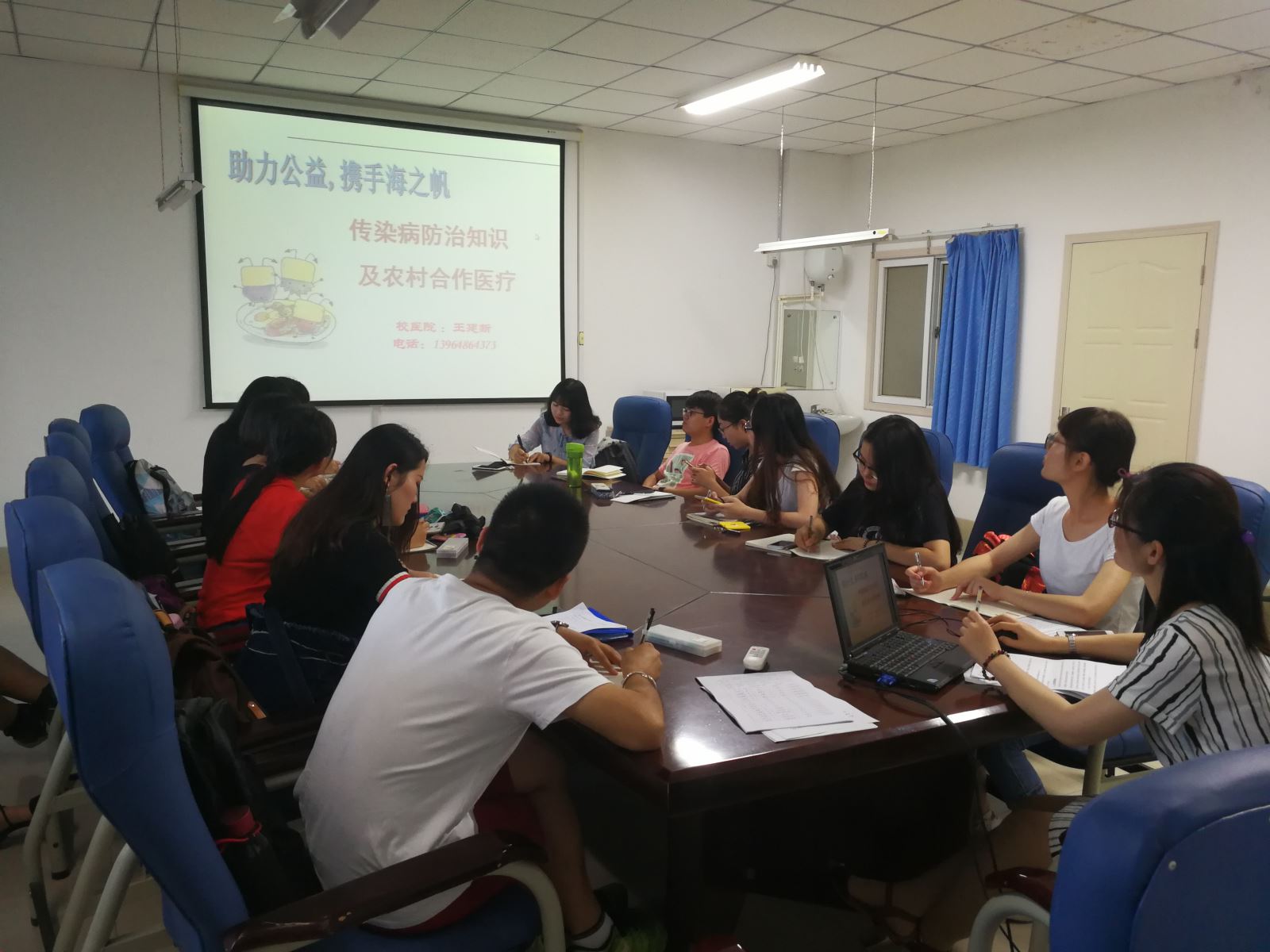 会议伊始,调研队成员与各位医生对本次暑期“三下乡”活动开展的根据地—云南省红河州展开现状分析,结合当地实际经济、设施条件,为此次调研下乡制定可行计划。接着到了会议的中心环节,由王建新医生作为主讲人,向队员们详细介绍了八种常见传染病的防控知识以及红河州新型农村合作医疗保险的相关政策和现状,并与队员分析当地医疗卫生条件,结合依据分析当地可能易发的感染病,并给出相关解决方案。大家认真参与讨论,积极给出个人意见和看法,收获甚多。最后,团队结合以往实践经验,对即将面对的困难和筹备工作进行了分析和规划,完善项目计划,并与各位医生进行交流。至此研讨会顺利结束。