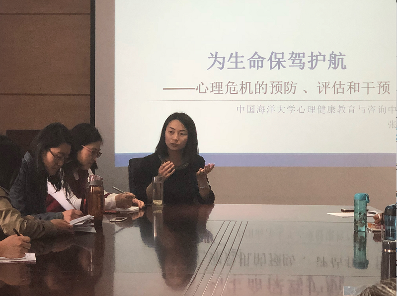 张迪结合自己近十年工作中接触的实例,向与会老师讲授了心理危机的预防方法,并提出了心理危机评估4步法,即识别危险因素、识别保护因素、询问自杀情况与确定危机水平。张迪强调,老师在向学生提供情感支持时,要正确表达关心,学会倾听与共情。