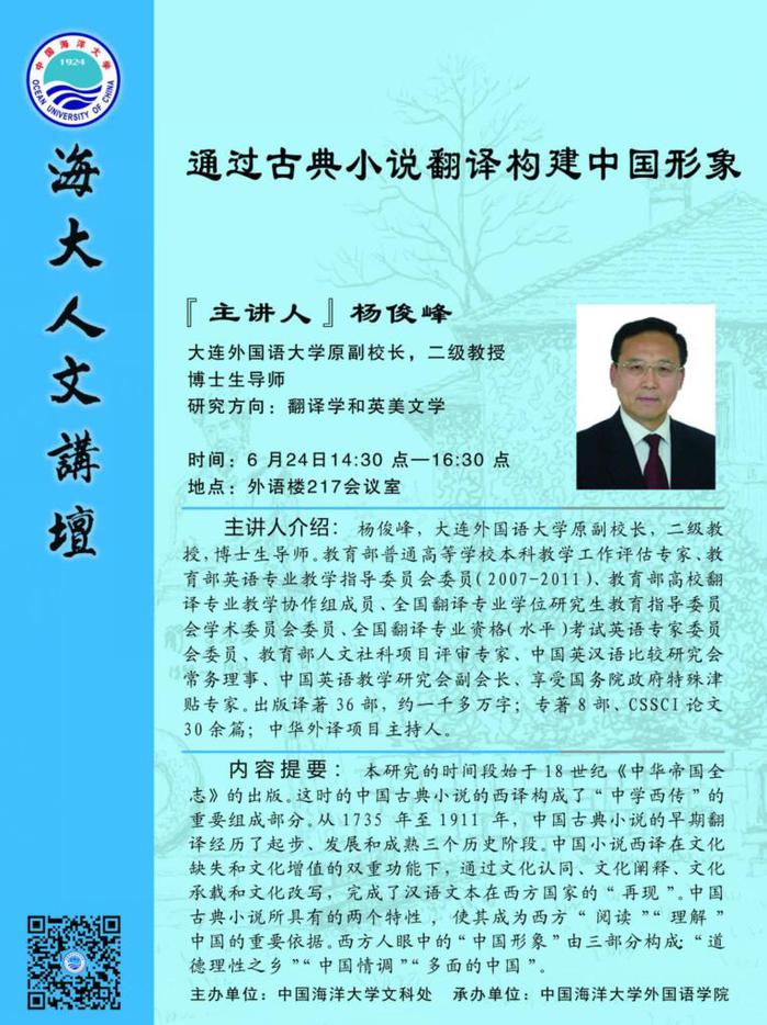 【讲座预告】通过古典小说翻译构建中国形象 —— 杨俊峰