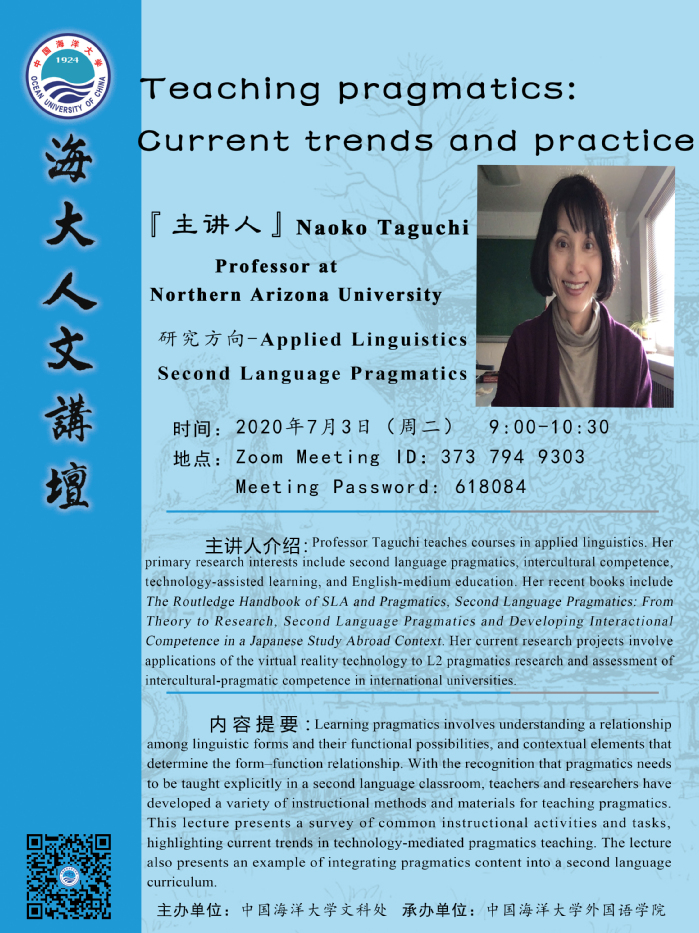 【讲座预告】Teaching pragmatics:Current trends and practice —— Naoko Taguchi