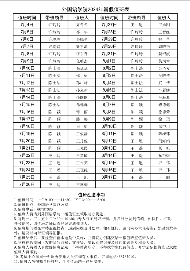 外国语学院2024年暑假值班表