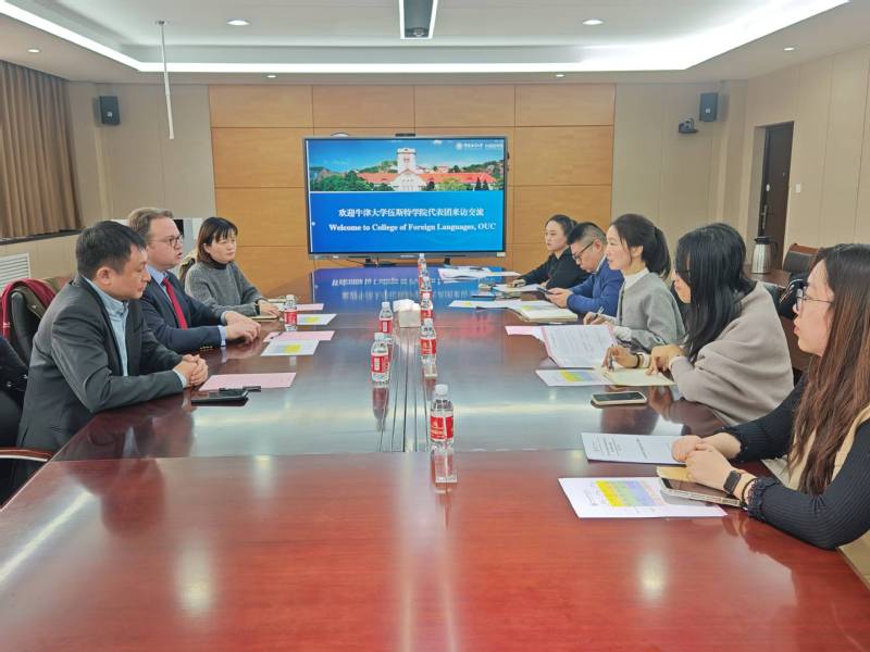 【本站讯】12月17日,牛津大学伍斯特学院Dominik教授一行访问外国语学院,国际合作与交流处副处长刘泰、副院长陈颖教授、英语系副主任郎玥等参加会谈,会谈由陈颖主持。