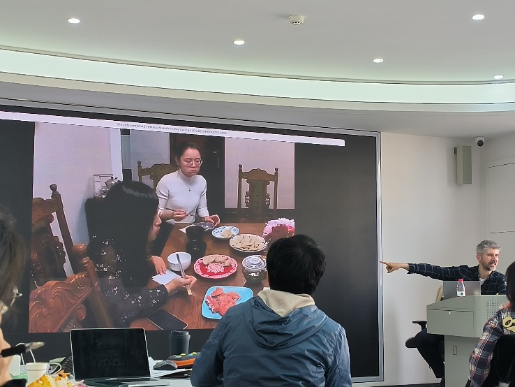 首日课程聚焦多模态研究理论与方法体系。Kendrick上午的课程以模块化教学展开,系统阐释了多模态研究的核心框架。他首先通过视频语料分析了多模态交互的三大要素,即指示表达(indexical expressions)、具身行动(embodied actions)与时序协同(temporal coordination);继而对比、评述传统语言学四组经典概念(语言/言语、语言能力/语用能力、语言/副语言、言语/非言语交际)的理论局限,论证多模态研究范式的科学价值;最后结合实证案例,深入剖析多模态研究的定义体系、互动资源整合及社会行为分析方法。在肢体语言(gesture)专题环节,他完整梳理了肢体语言的界定标准、发展阶段与构成要素。下午的课程侧重实践能力培养。Kendrick通过workshop形式,指导与会者运用专业软件进行多模态语料标注与转写,并结合分组讨论深化理论学习,有效提升了与会者多模态会话分析研究方法的理论素养与实践能力。