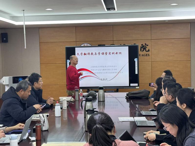 【本站讯】2025年2月27日下午,我国著名翻译家和外国文学研究专家、中国中外语言文化比较学会小说研究专业委员会会长、《小说研究》主编、上海师范大学朱振武教授应邀做客海大百川讲坛,并同我院广大师生进行学术交流。讲座由李锋教授主持,来自我院各个语种的文学、翻译等方向的老师以及研究生同学到场参加。