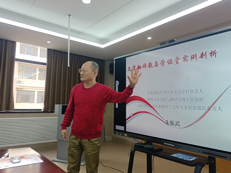 朱振武教授以“文学翻译教与学课堂实例剖析”为题,以其多年的翻译教学经验为出发点,分享了他对于翻译课程以及学生教育的看法。讲座开场,朱老师便指出:如今翻译专业的学生普遍缺乏文化素养,亟需通过广泛阅读来开阔眼界、增长见识。随后,朱老师结合大量实例,尤其是以美国诗人弗罗斯特的诗歌《雪夜林边驻足》的不同版本译文为例,分享了自己的翻译教学心得。朱老师广博的知识面和生动幽默的语言使得整场讲座气氛十分热烈。