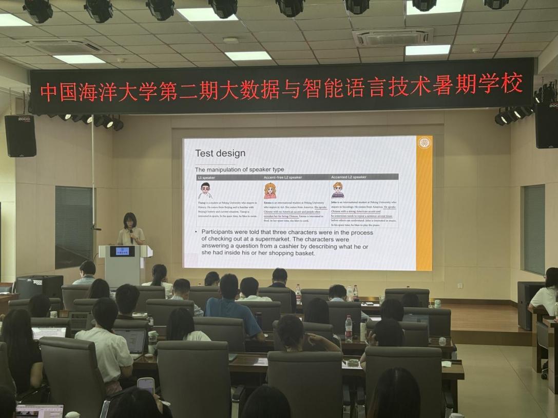 冯硕系统梳理了语用推导的核心概念与研究范畴,重点阐释了语用含义的主要分类--包括言外之意、等级含义、预设及反讽等基础理论,为后续的研究解读奠定了扎实的理论框架。在详实的理论铺垫之后,冯硕重点介绍了其团队近期的研究成果——Chinese Comprehenders’ Interpretation of Underinformativeness in L1 and L2 Accented Speech Narratives(汉语母语者对一语及二语带口音/无口音叙事中信息不足现象的解读)。她详细讲解了该研究的设计思路与实施过程。为精准分离 “语言可理解性” 因素的干扰,该研究采用“伪装设计的句子判断任务”,以书面句子作为实验刺激,探究了中国英语学习者如何理解三类话语中的语用含义——即一语叙事、无口音二语叙事、有外国口音二语叙事中,包含“等级含义”与“特殊语境含义(Ad hoc implicatures)”的信息不足表达。该研究发现:外国口音为二语使用者带来了显著的“社会优势”,具体表现为他们在交流中出现的信息省略行为更易被理解者容忍,且其个人更可能被感知为具有积极的社交特质;中国英语学习者的双语能力特征,以及“等级含义”与“特殊语境含义”在推导过程中存在的语言复杂性差异,共同影响了他们对二语使用者“信息不足句子”的解读逻辑。