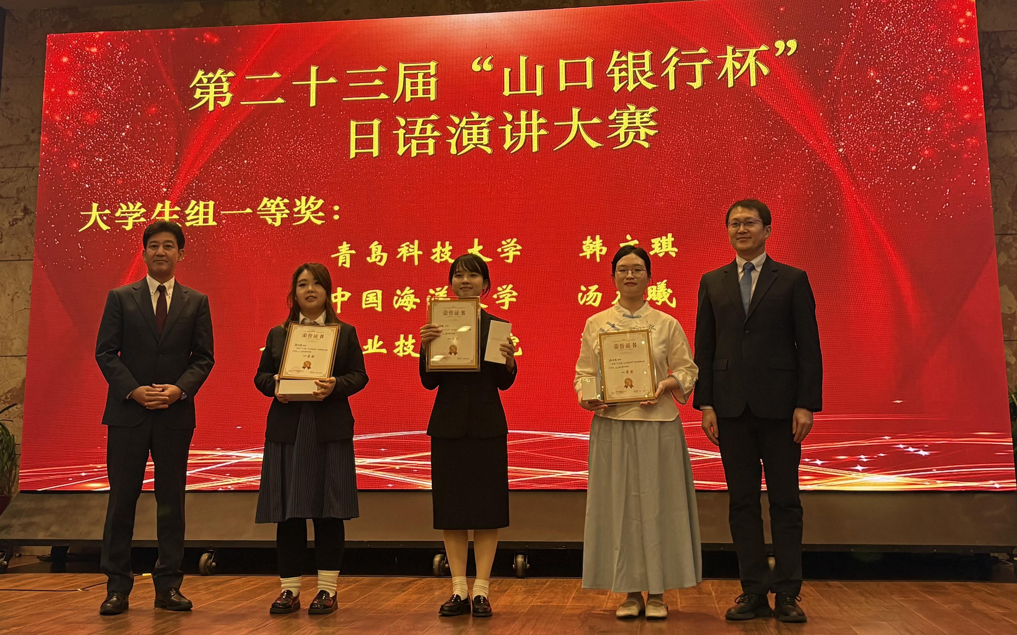 【本站讯】11月15日,第二十三届山口银行杯日语演讲大赛决赛在青岛花园酒店隆重举行,本次比赛共有来自开云电竞网址、青岛大学和青岛科技大学等十余所驻青高校的40名选手参赛。经过激烈角逐,外国语学院日语系本科生汤晨曦和焦皓楠分获大学生二组一等奖和二等奖,学院日语系教师路秀丽获颁优秀指导教师奖。