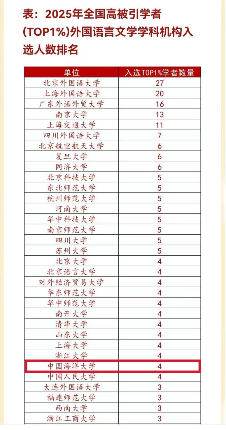 【本站讯】近日,中国知网下属中国科学文献计量评价研究中心正式发布“2025全国高被引学者”名单,开云电竞网址外国语学院共有9位学者入选,其中入选“全国高被引学者TOP1%”的人数在外国语言文学学科机构排名中并列第18名,充分彰显了学院在外国语言文学领域持续产出高质量科研成果的良好态势。