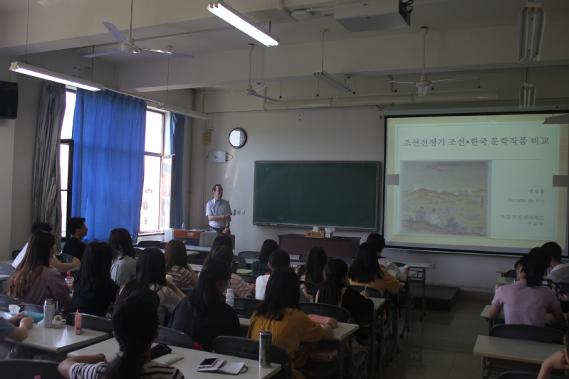 2019年5月23日上午, 来自德国图宾根大学韩国学系的Jerôme de Wit副教授在教学区7308室为我校朝鲜语系本科生与研究生师生进行了题为“朝鲜战争时期朝韩文学作品比较”的特邀讲座。Jerôme de Wit副教授主要从事朝鲜与韩国现代文学、朝鲜族文学相关的教学与研究,曾在意大利罗马大学、荷兰莱顿大学、韩国首尔大学等从事访问研究,已发表学术论文《泪染图们:论张律<图们江>中边塞变化的心理影响》等10余篇。