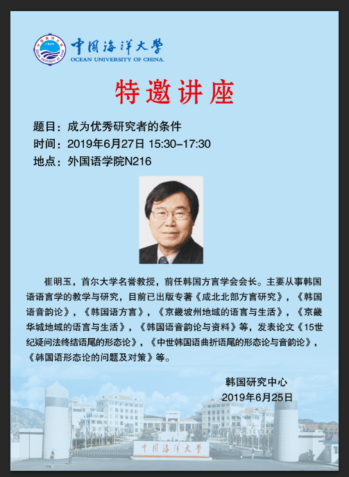 崔明玉,首尔大学名誉教授,前任韩国方言学会会长。主要从事韩国语语言学的教学与研究,目前已出版专著《咸北北部方言研究》,《韩国语音韵论》,《韩国语方言》,《京畿坡州地域的语言与生活》,《京畿华城地域的语言与生活》,《韩国语音韵论与资料》等,发表论文《15世纪疑问法终结语尾的形态论》,《中世韩国语曲折语尾的形态论与音韵论》,《韩国语形态论的问题及对策》等。