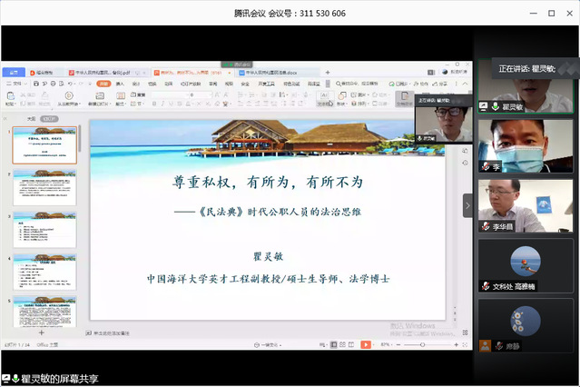 6月16日下午,机关文科处党支部、科技处党支部、发展规划处党支部、党委宣传部新闻中心党支部联合船舶中心党总支办公室综合党支部以腾讯会议形式进行集体学习。法学院瞿灵敏副教授应邀作“尊重私权,有所为,有所不为——《民法典》时代公职人员的法治思维”的讲座。文科处党支部副书记席静主持本次集体学习。