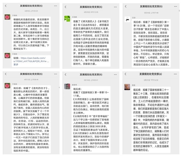 支部将《国家相册》的学习,融入日常,融入集体活动中。一方面,依托“发展规划处党支部微信群”,专人负责安排每周自学任务,学习完成后每位党员在微信群中发表感想。另一方面,在每次集体学习时组织大家共同收看2期《国家相册》,并进行研讨交流。同时,按时收集、整理大家的学习心得体会,作为党支部党史学习的重要记录之一。