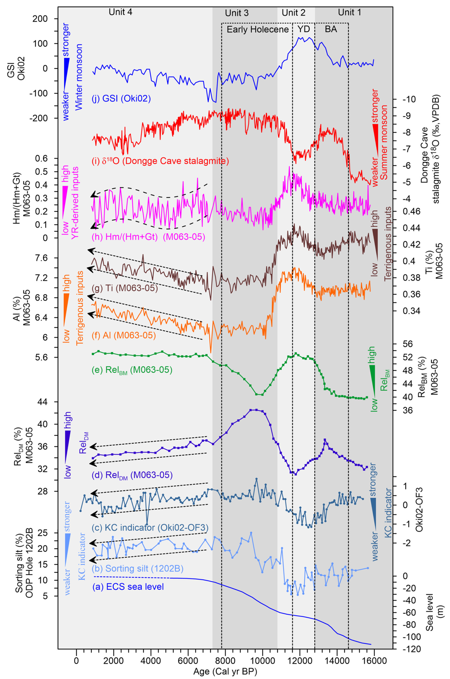 图2. 末次冰消期以来冲绳海槽中部沉积物来源(f-h)与黑潮演变记录(d-e)