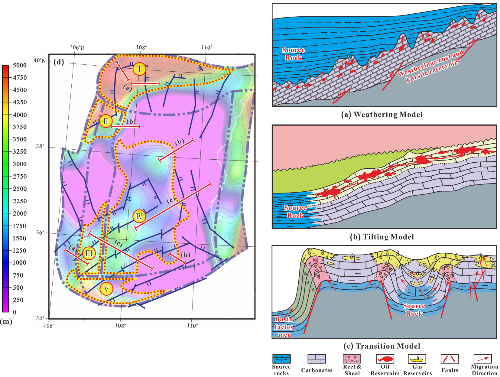 同时,古裂陷槽为富含有机质的页岩和烃源岩也提供了空间条件,结合古气候和岩相古地理分析,指出了5个中新元古代的含油气有利区带(伊盟隆起西北部、天环凹陷北部、天环凹陷南部、伊陕斜坡西南至中部和渭北隆起西部),总结出受古裂陷控制的3种油气成藏模式,即风化成藏模式、倾斜成藏模式和过渡成藏模式,在伊盟隆起中西部和天环凹陷南部的储层被后期风化作用改造,油气具有从上古生界煤系烃源岩向元古界风化壳中运聚的特征,具有典型的风化成藏模式,是未来“深地”油气资源勘探的首选区域。