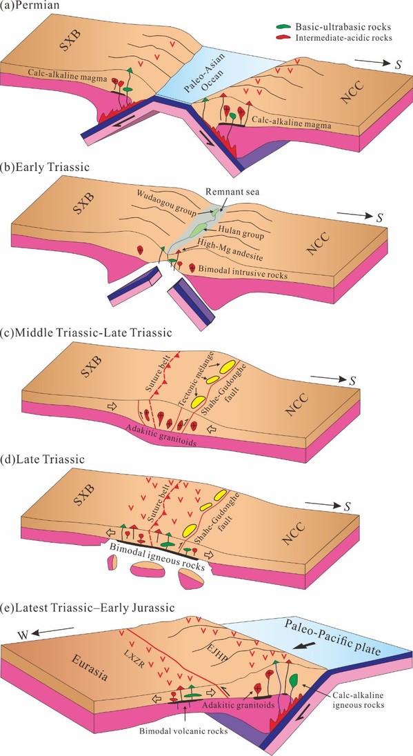 中国东北地区在晚古生代期间经历了古亚洲洋的闭合,中生代时期经历了古太平洋板块西向俯冲作用的叠加与改造,使东北地区成为研究古亚洲洋构造体系与古太平洋构造体系构造转换的关键地区。尽管前人做了很多相关的研究,但是关于中亚造山带东段古亚洲洋闭合与古太平洋板块俯冲起始时间的问题仍然存在争论。为此,本文作者基于对沿着长春-延吉缝合带分布的晚古生代-早中生代岩浆岩的年代学和地球化学特征进行了系统的研究与总结,二叠纪期间在缝合带的两侧均有钙碱性岩浆岩分布,代表了古亚洲洋双向俯冲的作用;早-中三叠世的岩浆活动以高Sr低Yb的埃达克质花岗岩为主,结合呼兰群顺时针变质作用,限定了古亚洲洋最终闭合于早-中三叠世;晚三叠世早期的岩浆活动多为A型花岗岩、A型流纹岩和镁铁质、超镁铁质侵入岩的双峰式岩石组合,代表了古亚洲洋闭合碰撞造山后伸展减薄的构造环境;三叠纪末期-早侏罗世形成了大量的钙碱性岩浆活动,呈南北向平行于东亚大陆边缘分布,同时具有从西向东时代逐渐变新的趋势,代表了古太平洋板块向东亚大陆下俯冲开始。因此我们得出结论:古亚洲洋构造域与古太平洋构造域的转换时代为三叠纪末期。