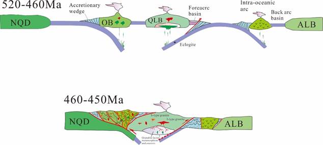典型大陆弧剖面变质-深熔-岩浆作用是理解俯冲带壳幔相互作用,以及大陆地壳的形成与再造过程的理想研究对象。本研究基于祁连地块北缘同时期麻粒岩相变质作用、深熔作用和岩浆作用构建了完整的古生代大陆弧结构剖面(图1)。该弧剖面从深部到浅部依次由麻粒岩、混合岩、角闪岩、弧岩浆岩和火山岩组成。下地壳深部主要由中高压基性麻粒岩和长英质麻粒岩组成,对应的峰期温压条件为11-13 kbar,800-950 ℃,对应地壳深度约35-45 km。高压基性麻粒岩和局部石榴子石堆晶基性残留相代表角闪石脱水熔融和石榴子石转熔产物。锆石 U-Pb 年代学结果表明,这些高级变质岩在~450 Ma 经历了峰期麻粒岩相变质作用。在下地壳的上层,最主要的岩石是先存的含石榴子石变沉积岩、正片麻岩和局部石榴角闪岩,它们同样在~450Ma的时候在20-30千米深处经历了中压角闪岩相到麻粒岩相变质-深熔作用。中浅部地壳主要由一系列年龄为500-450 Ma,具有多种起源的闪长岩、花岗闪长岩和火山岩组成,记录了地壳长期的生长和分异再造过程。总体上,祁连地块北缘大陆弧剖面描绘了两期大陆地壳生长(图2),包括:(a)第一期大陆地壳生长发生在北祁连洋南向俯冲期间500-480 Ma,被改造的岩石圈地幔和俯冲洋壳部分熔融形成同期中基性侵入岩和火山岩组合,伴随角闪岩相变质作用; (b) 第二期大陆地壳生长发生在大洋俯冲到初始碰撞期间460-450Ma,被改造的岩石圈地幔部分熔融所形成了基性岩,伴随麻粒岩相变质-深熔作用。