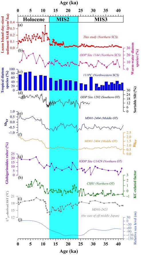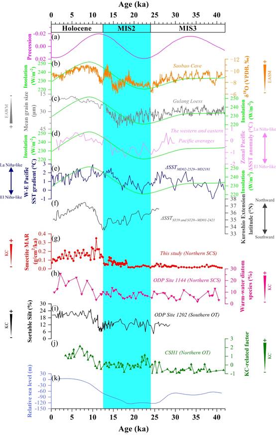 黑潮(KC)通过将高温高盐的水从低纬水域输送到中高纬水域,在全球气候变化中扮演着重要的角色。然而,在轨道时间尺度上,KC的演化及其主要控制因素仍不清楚。本研究利用来自南海北部陆坡岩芯SCS0003沉积物(图1)中陆源MARs、粒度、粘土粒级的Sr-Nd同位素和粘土矿物的高分辨率的记录,重建了过去42kyr以来KC的演化。粘土粒级的Sr-Nd同位素和粘土矿物的物源结果了表明岩芯沉积物中蒙脱石主要来自吕宋岛,在冰期深海氧同位素阶段(MIS)3和MIS2时期吕宋岛的蒙脱石比例很小,且两个阶段比例基本想当,但在全新世期间,蒙脱石含量增加了大概3-4倍。另外,蒙脱石的沉积通量表明在轨道尺度上KC侵入南海与开阔太平洋的KC的强度变化具有相同的趋势,而不是的相反的趋势。同时,进一步揭示在末次冰期的MIS3和MIS2阶段KC相对较弱且变化幅度较小;而在全新世KC变强且变化幅度比较大,早期迅速增长而中晚期呈下降趋势(图2)。除此以外,岁差周期太阳辐射变化控制的厄尔尼诺-南方涛动(ENSO)、东亚季风(EAM)的叠加作用控制着KC的轨道时间尺度演变,而不是仅由ENSO作为主要的控制因素(图3和图4)。该研究能更深入的了解在太阳辐射强迫的早期响应现象中岁差日照变化,驱动的低纬热带过程在低纬度地区与中高纬度地区之间的热量和水汽传输过程中起非常着重要作用。因此,在轨道时间尺度上,该研究结果强调了低纬度过程在驱动全球气候变化中的同样重要性,而不仅仅是高纬度过程的作用。