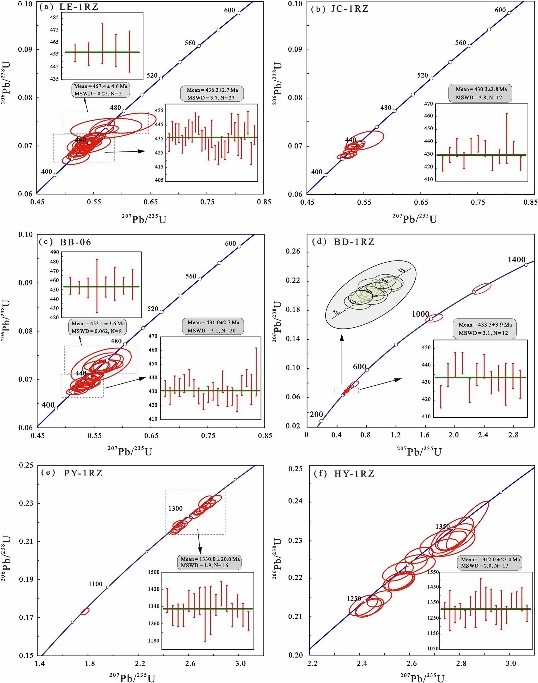 图1 抱板杂岩片麻状花岗岩 (a) 和石英二云母片岩(b-f) 中独居石U-Pb谐和和加权年龄图