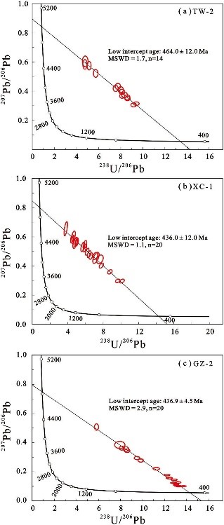 图2 抱板杂岩斜长角闪岩(a、b)和黑云斜长片麻岩(c)中榍石U-Pb年龄反谐和图