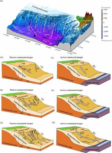 在南海形成和演化过程中,南海北部大陆边缘发育了多个裂谷盆地和海底峡谷体系。台西南盆地位于南海东北部大陆边缘,是一个新生代伸展型断陷盆地,盆地内发育多条海底峡谷和海底水道(图1)。以往对于台西南盆地内峡谷的研究多集中在单一峡谷或峡谷群的形成、发育和演化研究,对盆地中广泛发育的海底水道缺乏关注,且还未对海底峡谷和海底水道系统形成过程和机制进行深入的研究。海底峡谷和水道作为连接陆架和海沟的重要地貌单元,不仅是陆源碎屑物质由陆架运移至深海的主要通道,也是沉积物主要的侵蚀区。研究台西南峡谷-水道系统(TCCS)的地貌特征及其成因机制,对于深入理解区域沉积源-汇体系、峡谷群形成与演化过程、沉积物的搬运及沉积作用以及海底灾害方面具有重要科学意义。本研究依据“东方红3号”采集的多波束数据和前期地震反射剖面数据,分析了峡谷-水道系统的地貌特征、大陆边缘坡度变化特征及重力流与底流对峡谷作用,构建了台西南海底峡谷-水道系统的三阶段发育过程和形成机制。