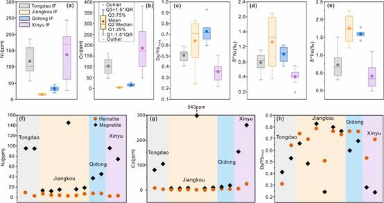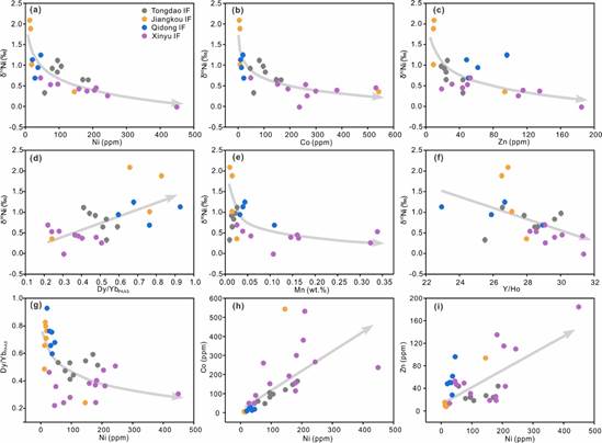 u古地理位置更靠近大陆边缘的新余IF中,磁铁矿表现出最高的Ni和Co含量及Ni/Fe摩尔比,δ56Fe、δ60Ni和Dy/YbPAAS比值则为最低。