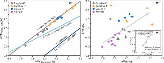 u共生赤铁矿与磁铁矿中δ56Fe值基本一致(赤铁矿:0.20‰ 到 2.27‰;磁铁矿:−0.20‰ 到 2.25‰);