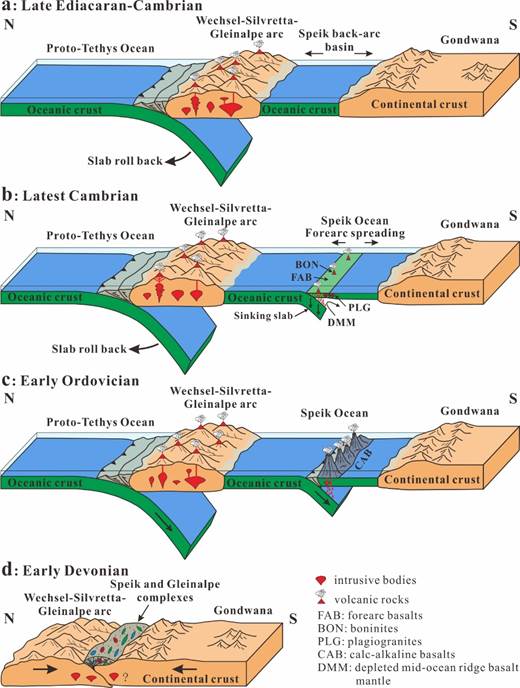 综合我们新发表的数据与已有成果,我们重建了冈瓦纳大陆北缘从埃迪卡拉纪末期至早古生代的构造演化过程。在埃迪卡拉纪末期至早寒武世,西原特提斯洋的俯冲后撤导致Wechsel-Silvretta-Gleinalpe大陆弧从冈瓦纳大陆北缘裂解,形成了Speik弧后洋盆。至晚寒武世–早奥陶世,Speik洋内发生洋-洋初始俯冲,并逐渐发展成一个洋内弧系统。到早泥盆世,随着Speik洋的闭合,Wechsel-Silvretta-Gleinalpe大陆弧重新拼贴到冈瓦纳大陆北缘,并引发了~400 Ma的变质事件(图2)。