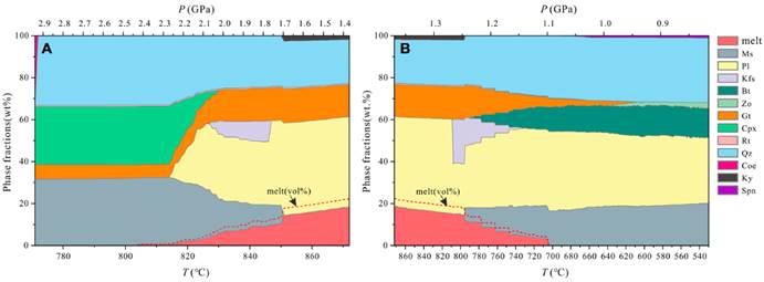 图2 沿P-T轨迹熔融过程矿物-熔体相变化堆积图