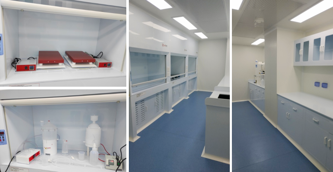 超净前处理室用于样品的化学超净前处理。前处理室的温度、湿度、压力采用自动控制,整体空气洁净度级别为:前处理室、天平室等千级,仪器室万级,更衣室和操作间为十万级,实验操作柜洁净度级别为百级。可以确保高质量地完成各种同位素的化学分离和纯化实验。