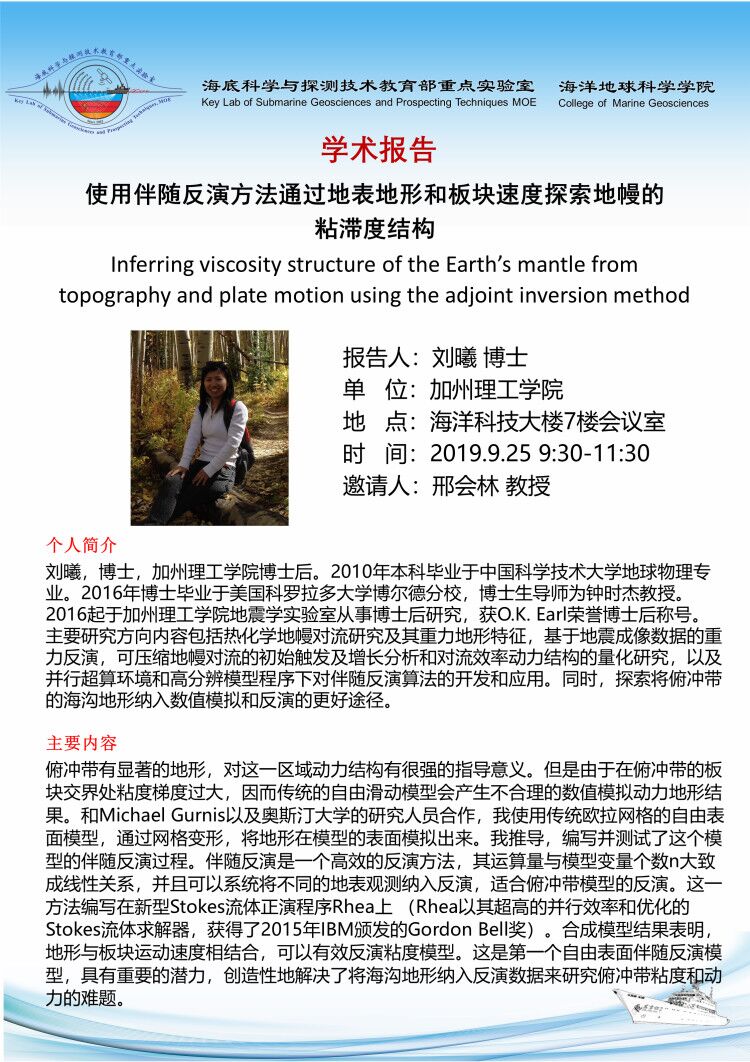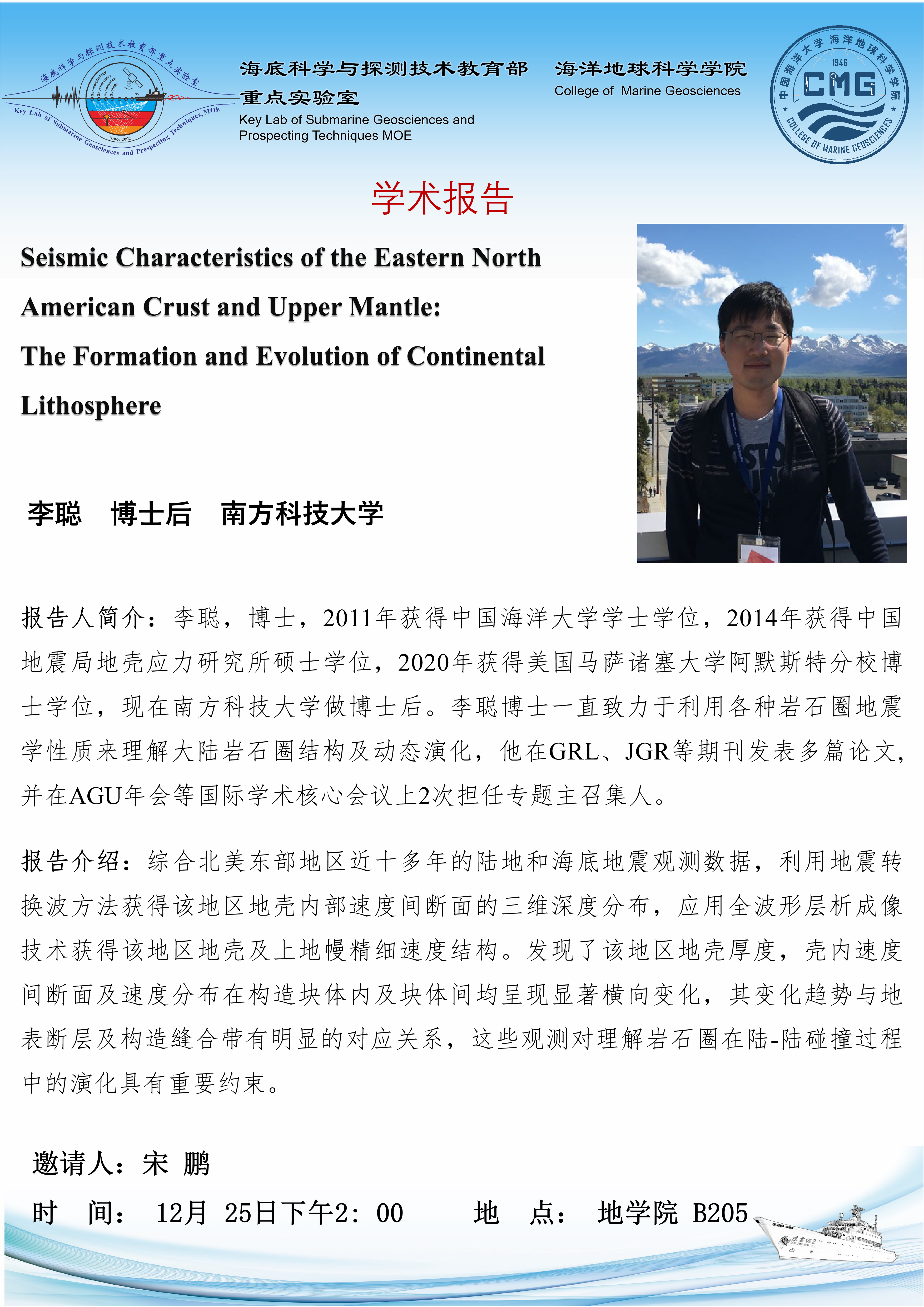 南方科技大学李聪博士后应邀作学术报告,时间: 12月25日下午2: 00,地点: 地质楼 B205