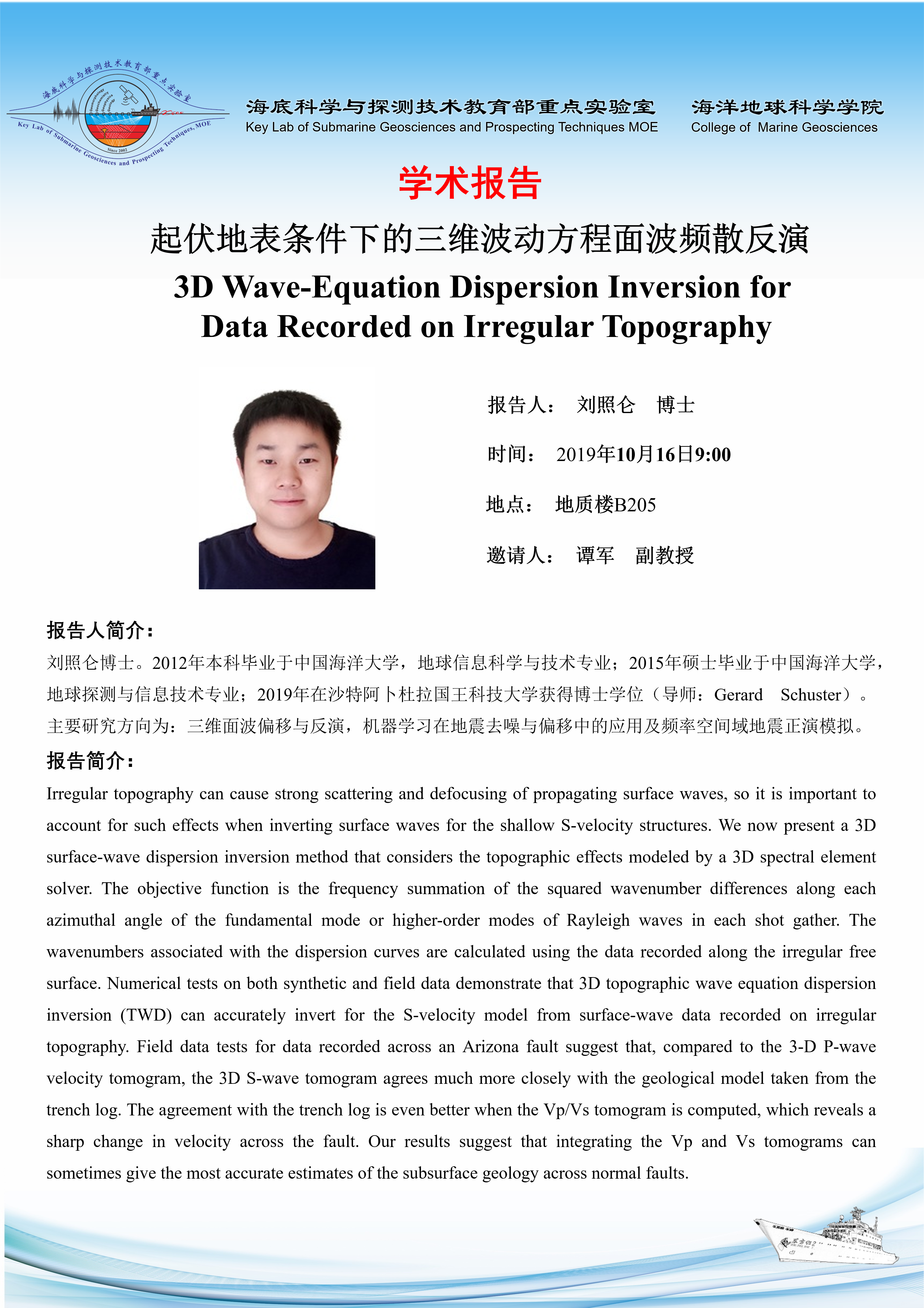 应重点实验室谭军副教授邀请,沙特阿卜杜拉国王科技大学 刘照仑博士应邀做主题为“起伏地表条件下的三维波...