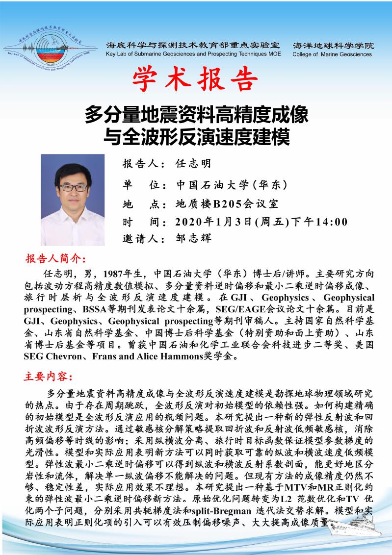 应重点实验室邹志辉副教授邀请,德克萨斯大学达拉斯分校杨继东博士应邀做主题为“矢量弹性波场分离及其在反...