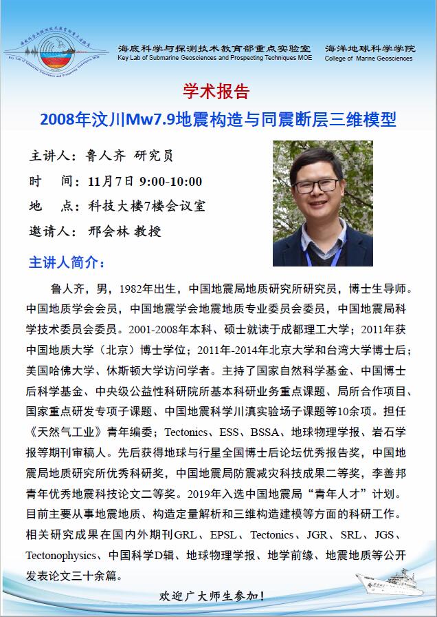 应重点实验室邢会林教授邀请, 中国地震局地质研究所鲁人齐研究员应邀来我校交流并做主题为“2008年汶川Mw7...