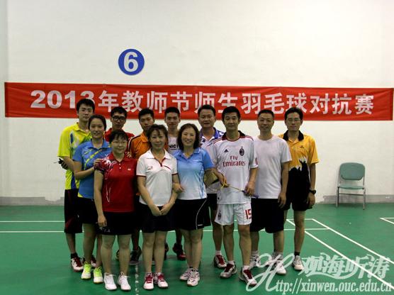 9月9号下午,2013年教师节师生羽毛球对抗赛在崂山校区羽毛球馆圆满落下帷幕。 本次比赛分为男女混双、女双、男双三阶段比赛,比赛形式为老师VS学生。混双阶段,由吴军和曹杨组成的老师队以压倒性的优势2:0击败学生队。接下来的女双,由曹杨、孙莉组成的老师队又轻松拿下一场胜利。男双阶段第一场,学生队的赵晨羽和冯博组合以精湛的技巧和配合打乱教师队的节奏,顺利拿下胜利;第二场,有赵有星和沈飚组成的老师队与陈禄森和曹迪凡组成的学生队势均力敌,在经过长时间的拉锯战之后,学生队以微弱的优势获胜;第三次,吴军、崔宏组成的老师队和赵晨羽、冯博组合进行激烈的对抗,最终老师队以2:1取胜。 本次比赛是由教职工羽毛球协会承办,本次比赛旨在促进老师和学生加强交流。在轻松愉快的氛围中,首届教师节羽毛球赛画上了圆满句号。