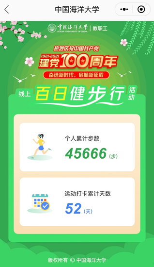 百年奋斗风雨兼程,扬帆起航谱写新篇。为庆祝中国共产党成立100周年,增强教职工健康意识,促进教职工形成良好的体育锻炼和健身习惯,享受运动带来的健康和快乐,校工会将于3月15日-6月22日开展全校教职工庆祝中国共产党成立100周年“奋进新时代,启航新征程”线上百日健步行活动。