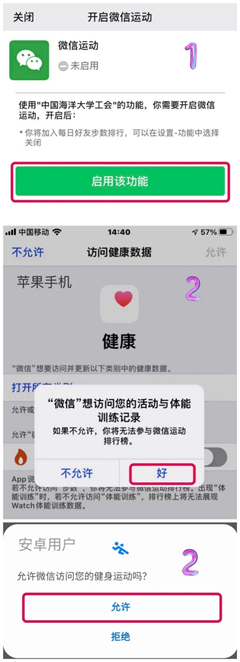 在菜单栏找到“百日健步行”小程序。打开并进行小程序跳转和微信运动授权。苹果手机用户需要允许微信运动访问手机的活动与体能训练数据,安卓手机用户需要允许微信运动访问手机的健身运动数据。