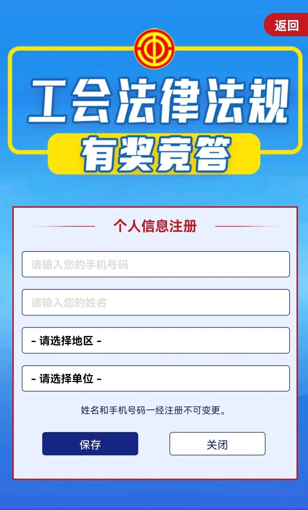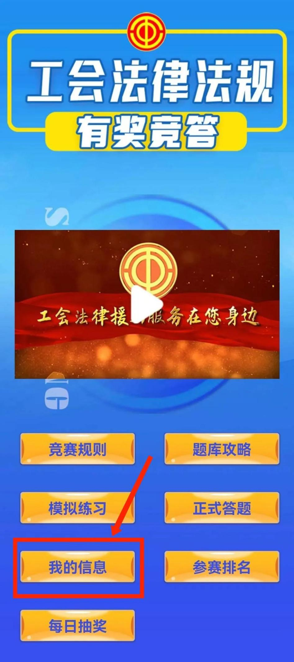 《工会法》有奖竞答活动 为进一步学习宣传新修订的《中华人民共和国工会法》(以下简称《工会法》)和《山东省工会劳动法律监督条例》(以下简称《条例》),普及工会法律法规知识,省总工会在《大众日报》微信公众号开展工会法律法规有奖竞答活动,市总工会组织全市工会工作者和广大职工积极参与,活动具体内容如下: 活动时间 2022年6月10日—6月24日,为期15天。活动分两个阶段:6月10日—6月14日为模拟竞答阶段,注册并进行模拟答题后共计入一次参与人数,不参与抽奖;6月15日—6月24日为正式竞答阶段,每人每天答题可计入一次参与人数,可参与抽奖。 知识学习 竞答活动将提供《工会法》《条例》题库供大家学习,同时提供全省工会法律服务宣传视频供大家观看。 竞答规则 每次竞答随机抽取5道题,每道题20分,总分100分。模拟答题供大家熟悉参赛模式,不记录分数,不组织抽奖。正式答题期间,单次竞答达到80分及以上的,可以参与每日抽奖,每天一次抽奖机会。每天不限竞答次数,以单次竞答最高得分作为当日得分。 竞答总得分达到1000分(连续参与竞答10天,每天最高得分均为100分)的人员,可在6月24日额外获得1次抽奖机会。奖项分为特等奖、一等奖、二等奖、三等奖四种类型。 奖项设置 每日抽奖 当日给予每人10元话费奖励 特等奖(10名) 荣耀手机、科沃斯扫地机器人、惠普家用打印机 一等奖(50名) 澳柯玛破壁机、SKG颈部按摩仪、华为手环 二等奖(100名) 迈宝赫筋膜枪、品魅蓝牙耳机、中石化加油卡 三等奖(200名) 100元话费 *特等奖、一等奖、二等奖获奖人员根据自身需要,在三种实物奖励中任选一种作为奖品。 竞答活动实时对各区市参与人次进行排名,欢迎大家积极参与! 参与方式 1.关注《大众日报》微信公众号,点击“工会竞答”,填写个人信息,选择所在区市后,即可参与竞答。