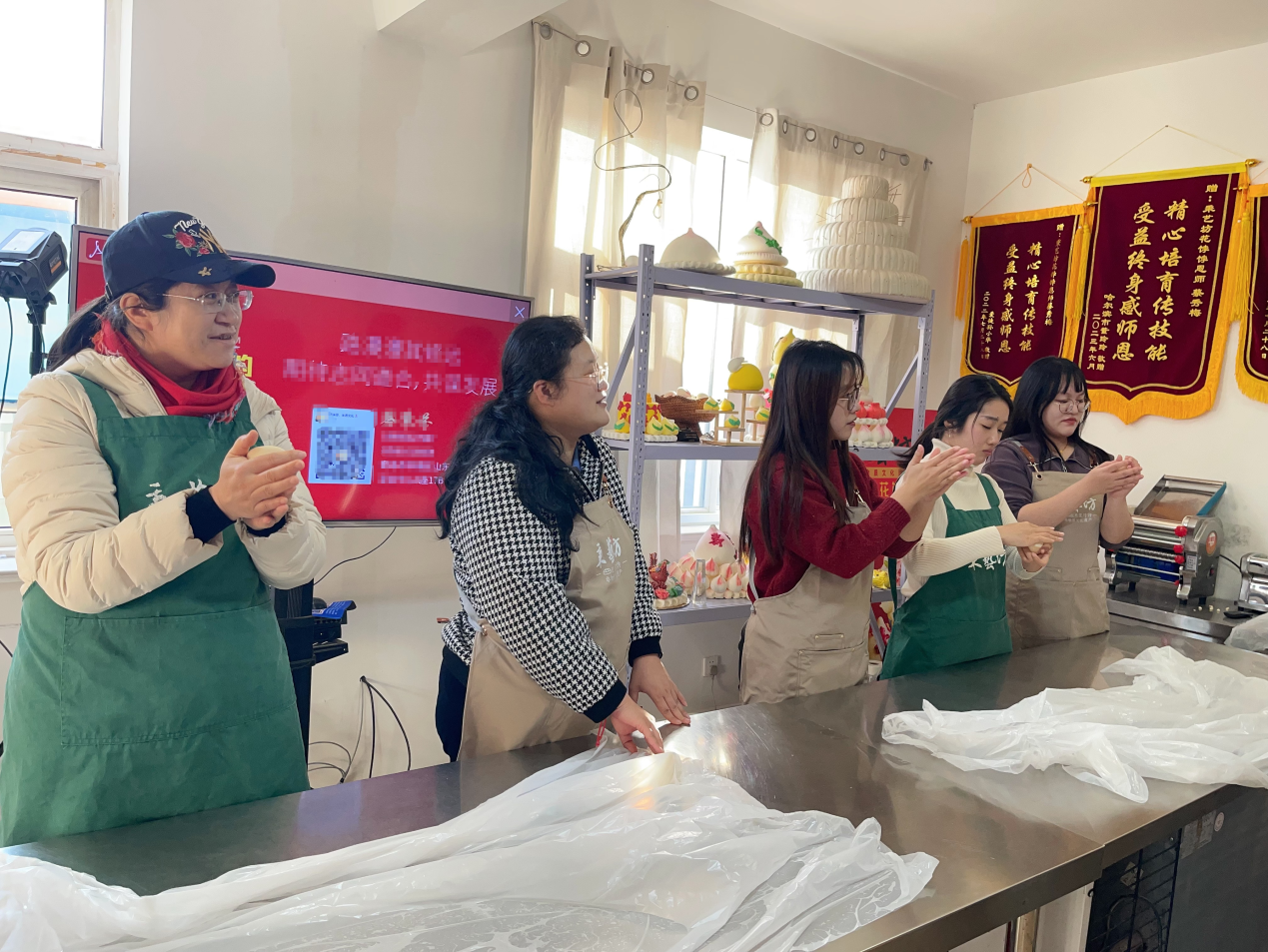 经济学院工会组织胶东花饽饽制作体验活动2024年12月11日下午,为弘扬中华优秀传统文化,增强教职工对非物质文化遗产的认识与体验,经济学院工会组织部分教职工来到王哥庄秉德文化有限公司开展胶东花饽饽制作体验活动。 此次活动邀请了胶东花饽饽非物质文化传承人蔡秉芬老师现场指导。蔡秉芬老师详细介绍了胶东花饽饽的历史渊源、制作工艺和独特之处,并展示了精美的花饽饽作品。这些作品形态各异,栩栩如生,有的如龙蟠虎踞,气势磅礴;有的似寿桃呈祥,喜庆祥和;还有的如凤凰展翅,优雅动人,充分展现了胶东花饽饽的艺术魅力。