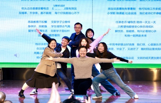 随后老师们来到学院乐海堂,参与元旦喜乐会主题活动。现场有全体教工暖场热舞、有各系各部门精心准备的节目、也有充满趣味的游戏互动。辅导员团队以歌舞“辅导员阵线联盟”向老师们展示了青春风采,学院办公室的“西域风情串烧”给老师们带来了来自大草原的异域情调,“文新歌神”周红老师的倾情演唱《投入地爱一次》引得现场欢呼阵阵……游戏互动和热身舞蹈环节中,教职工全员热情投入,积极参与;“固’自封”“真‘像’只有一个”、“原来是TA”几个游戏引得台上台下欢声、笑声、掌声不断,现场气氛火爆,热闹非凡。 十四年来,元旦喜乐会已成为文新工会的品牌活动,承包了学院老师们的开年欢乐。未来,学院工会将继续努力,让全体教职工在紧张的工作之余放松身心,在欢声笑语中增进感情,持续凝温馨、聚力量,共创学院美好未来。 |