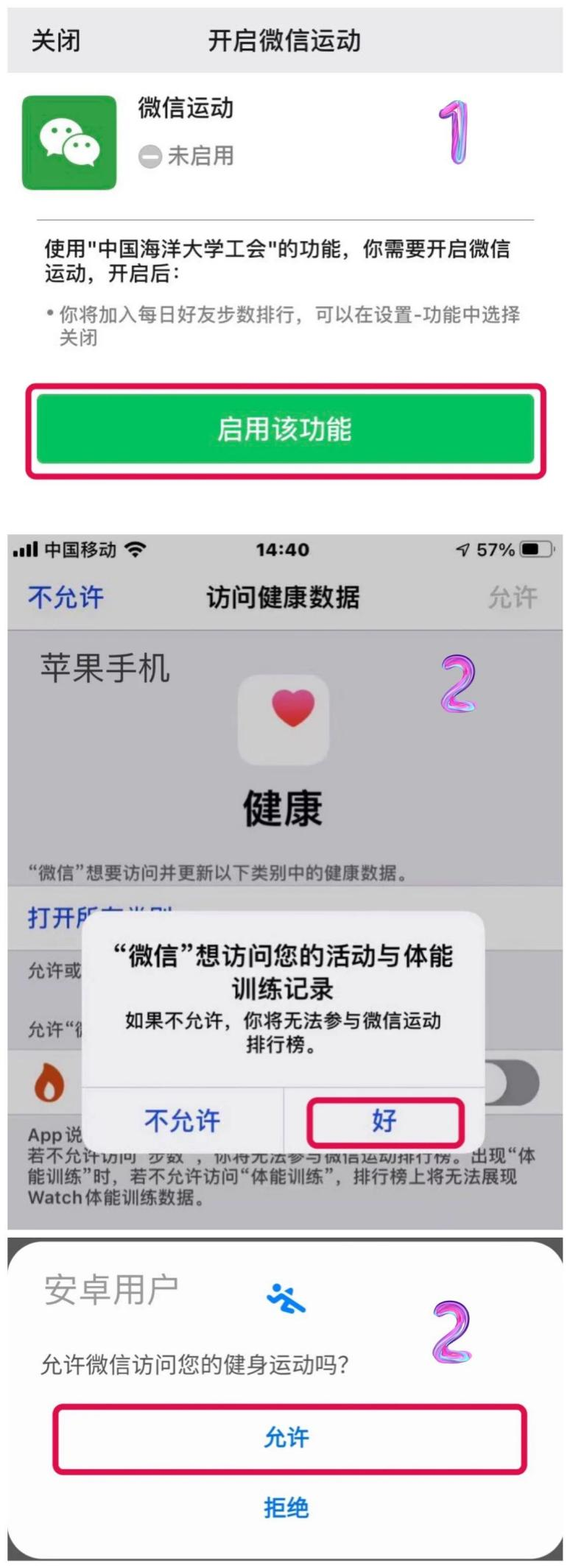 在菜单栏找到“百日健步行”小程序。打开并进行小程序跳转和微信运动授权。苹果手机用户需要允许微信运动访问手机的活动与体能训练数据,安卓手机用户需要允许微信运动访问手机的健身运动数据。