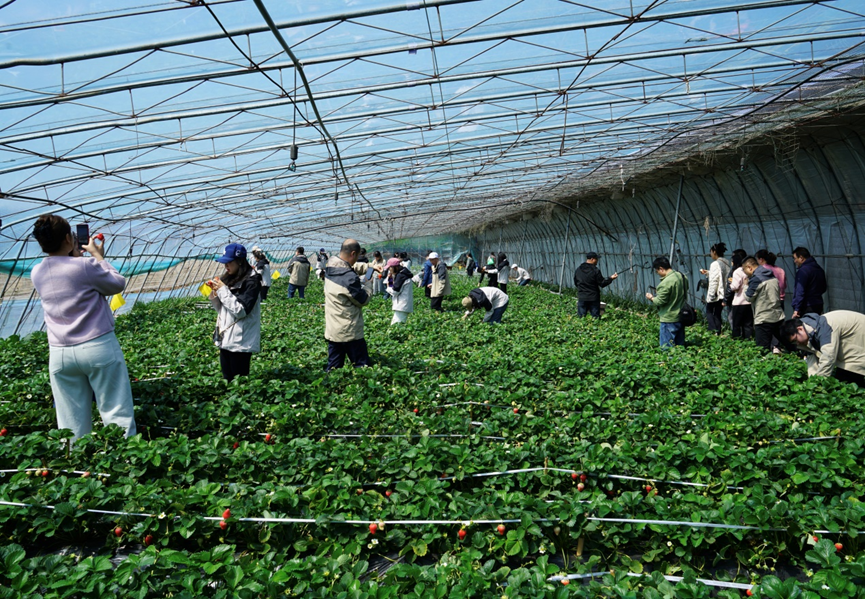 随后,员工们满怀期待地来到了草莓园,开启了采摘之旅。步入园中,红艳饱满的果实掩映在翠绿藤叶间,员工们仔细搜寻着成熟度最佳的草莓,时不时停下脚步,交流着各自对于不同品种草莓口感的见解,探讨哪个品种最为香甜可口。期间,大家还纷纷拿出手机,互相拍照留念,园中洋溢着浓浓的喜悦氛围。