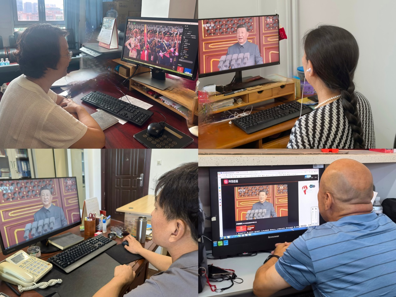 上午9:00,工会妇委会党支部全体党员在各自的工位上认真观看纪念纪念中国人民抗日战争暨世界反法西斯战争胜利80周年大会直播。官兵铿锵的步伐、先进的国防装备、雄壮有力的乐曲声,生动展现了新时代人民军队的强军风貌,大家激动不已,感慨万千,深刻理解“正义必胜、和平必胜、人民必胜”的历史真理,进一步坚定跟党走的信念。
