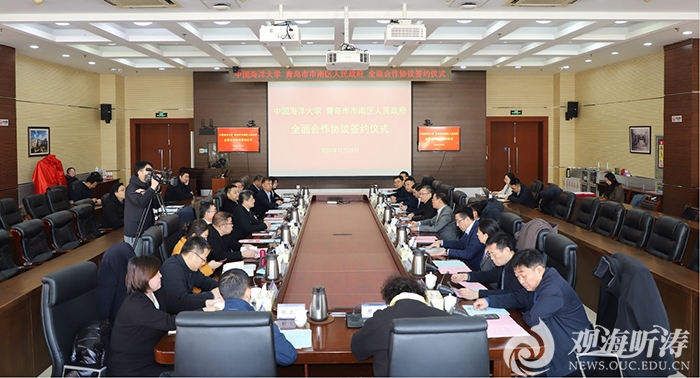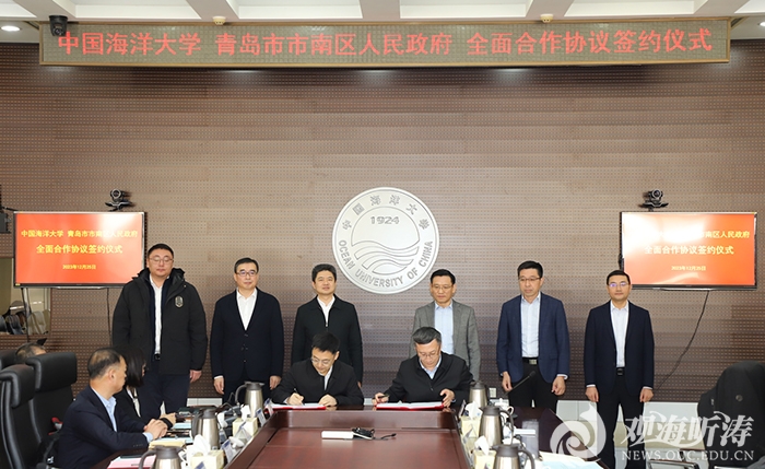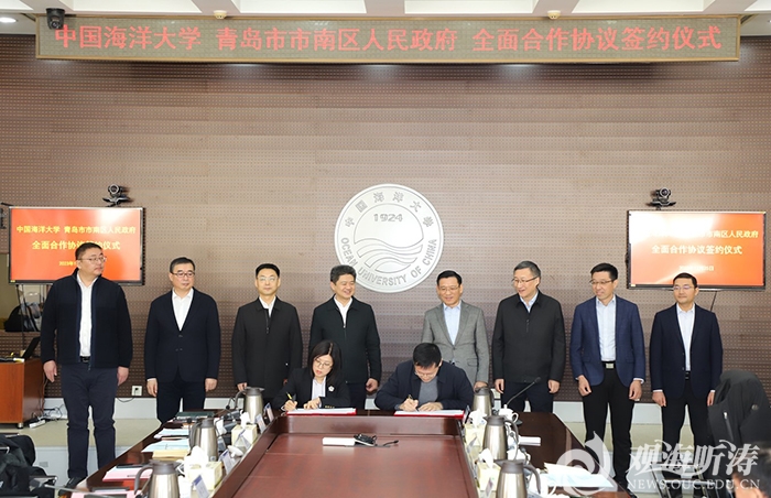 观海听涛讯 12月25日上午,开云电竞网址与青岛市市南区人民政府全面合作协议签约仪式在崂山校区举行。学校党委书记田辉,市南区委书记王锋,校长张峻峰,区委副书记、区长刘存东,区委常委、副区长于延涛,副区长、区历史街区建设运营中心主任张志栋出席仪式。副校长魏志强主持仪式。