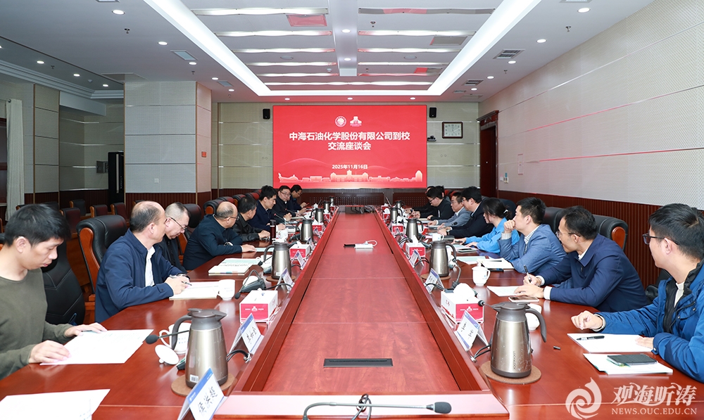 观海听涛讯 11月16日,中海石油化学股份有限公司(简称“中海化学”)党委书记、董事长侯晓峰一行到校调研。学校党委常委、副校长王厚杰,中国海洋石油集团有限公司(简称“中海油”)党组副书记武广齐陪同调研。