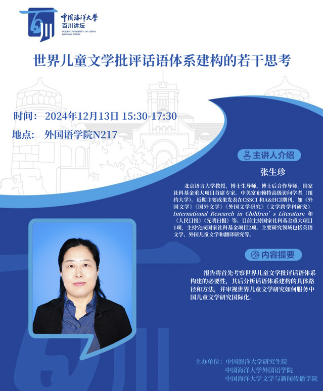 研究生百川讲坛 | 第415讲 张生珍:世界儿童文学批评话语体系建构的若干思考
